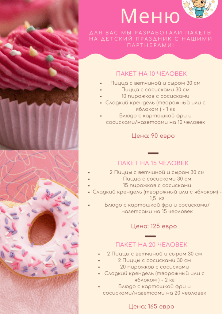 Для удобства мы создали пакеты питания, которые включают в себя любимые детские блюда. Питания можно выбрать на 10, 15 или 20 человек. Еда всегда свежая и вкусная, наши партнеры — кафе «Бакинский дворик» и пекарня «Колобок» готовят еду под заказ и к нужному времени.
