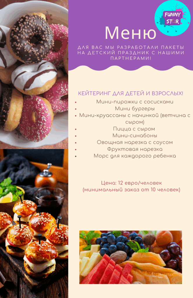 Мы собрали для вас самые распространенные позиции для праздничного стола и оформили в пакеты по количеству человек. Приготовлением еды для наших гостей занимаются наши партнеры — кафе Бакинский дворик, которое находится на первом этаже здания, поэтому вся приготовленная еда свежая и вкусная! Также мы можем составить и обговорить другое меню, по желанию клиента.